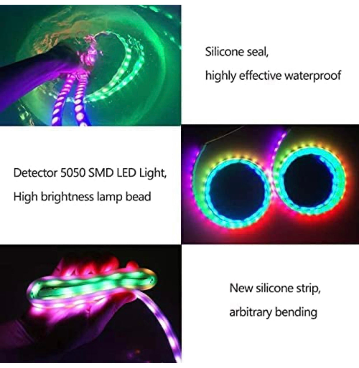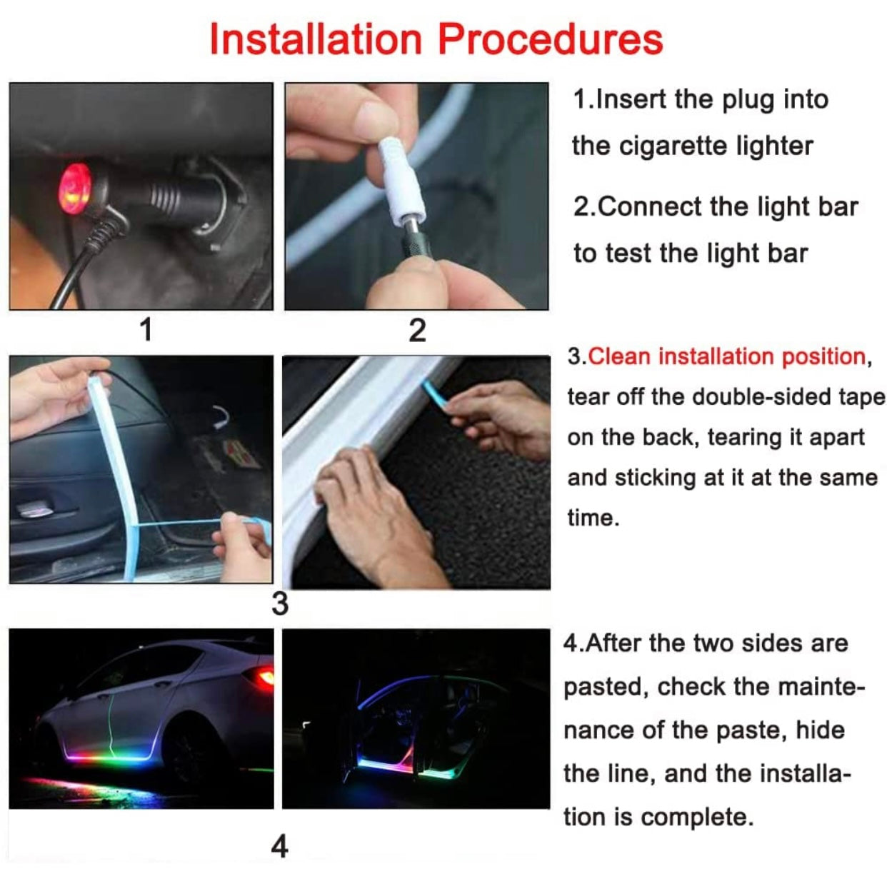 The light jumps with the music rhythm. 20 music modes and 40 non-music modes. Brightness and color can be adjusted freely. Use method and function can see the advertisement of APP and use effect and installation method can watch the video of advertisement. It can be bent, fold, wound and fixed in place easily.Car LED strip light is waterproof and save electricity. Even though door pedal light really bright, they're great power savers so you don't have to worry energy consumption. The LED under car glow system produces multi colors which are Blue, Green, Purple, Red, Teal, White, and Yellow. The LED under car glow system lights up colorful colors to give a stylishly stunning look to the areas you may want to put them on. The power interface is a cigarette lighter interface, which can be installed without damage without destroying the original power supply. No need to drill, no need to re-wiring, the door pedal light strip with double-sided tape on the back is easy to install.